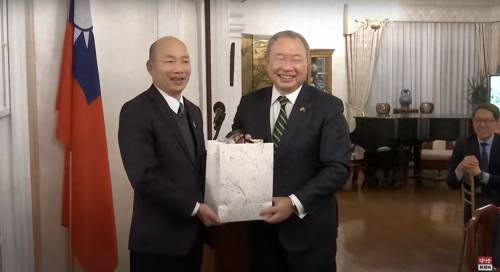 在参加完美国总统特朗普的就职典礼后,韩国瑜在当地时间1月21日参访了美国国会。参访美国国会结束后,台湾驻美国代表俞大送上国会的水晶。结果出人意料的是,韩国瑜再次说出金句,称“我想说代表处预算不够,还送这个,我于心不忍。”结果,俞大瞬间变得脸色尴尬,但很快就调整了过来,与韩国瑜微笑合影。