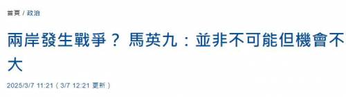 台湾地区前领导人马英九近日给出了自己的担忧,那就是两岸冲突并非不可能,但几率不大。在他看来,战争的代价对两岸都太沉重。他同时声称,备战当然有必要,但高昂的军费对台湾是沉重的负担。