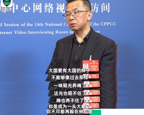 “在中国比较贫穷落后的时候,西方国家跟我们打交道是俯视,现在基本上是平视,个别情况下甚至是仰视,大国要有大国的样子,不能够像过去那样一味的韬光养晦了,这光也韬不住了,晦也养不住了,你是成为一头大象了,你不可能再躲在树后面。”