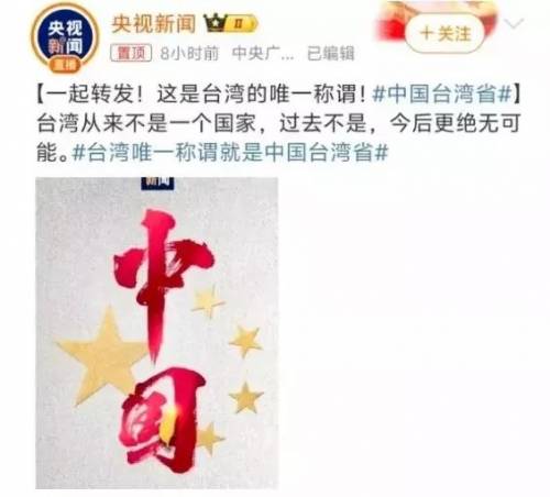所以,作为我们国家权威中央官媒的“央视新闻”,也随之而立即跟进并公开发文,呼吁一起转发“台湾的唯一称谓是中国台湾省”!