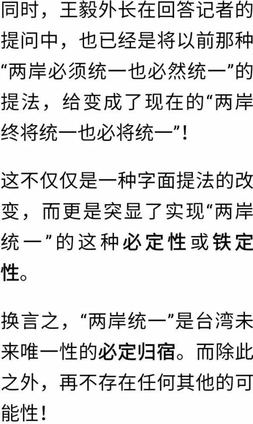 这是因为,王毅以其国家副国级领导及其中国外交部长的身份,在如此非同寻常的重要国际外交场合,面对着全世界媒体记者所公开作出的这种“台湾唯一称谓是中国台湾省”的定位,实际上也就是代表着我们国家中央政府官方,对现实“台湾地位和身份”的认定。