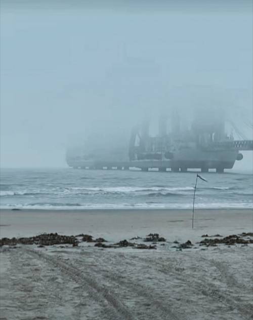 视频还显示,从近到远处的驳船是不一样的,最靠近海岸的驳船是四只脚的,远一点是六只脚的,最远的是八只脚的。这里就有个非常严肃的问题了,为什么这些驳船都要长脚?为什么驳船的脚数量还有多有少?为什么外海的驳船脚会更多?
