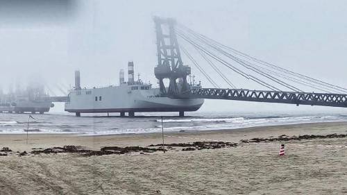 在社交媒体上出现这种“登陆神器”后,美媒TWZ非常敏感的捕捉到了这个动态,报道称这种船舶为“T-lpts”,或者是“民用螺旋式辅助转移-登陆平台”,这三艘特种船舶可以单独使用,也可以联起来使用,三艘相连总长度可达850米,可以满足数万吨的滚装运输船在将离海岸线900米外靠港后直接转移至陆地。TWZ报道还表示不排除有更多的船只可以对接起来,以延伸至更远的海域。