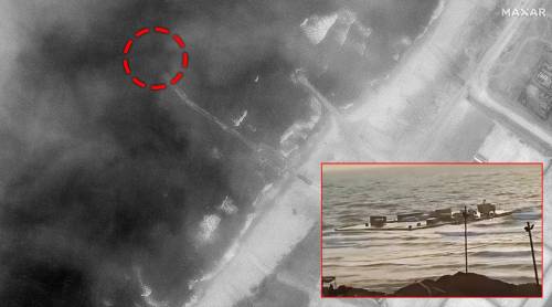 从视频展现来看,三艘特种驳船通过斜拉结构梁形成了一个长达数百米的人工港,据卫星图片分析,这个人工港长达850米,在靠近陆地的一侧有一个长达100多米的结构梁直接越过滩头驳接到了岸边。从850米外靠港卸载的坦克、装甲车以及物资等可以不经过登陆舰冲滩直接被转运至岸上。