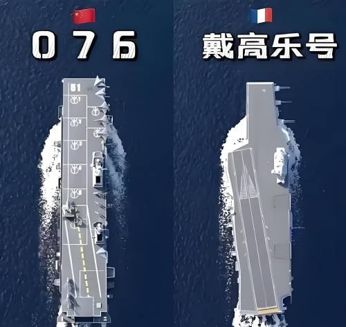 中国076比法国的“戴高乐”航母还要大,排水量高达4万余吨。可以容纳1500名全副武装的海军陆战队战士。