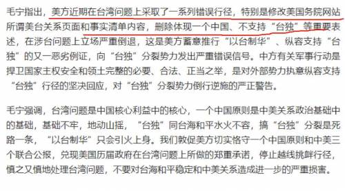 外交部发言人毛宁回答记者提问时,说出了解放军在台海军演的重要原因,即美国国务院删除了不支持“台独”、体现“一个中国”原则的重要表述,中方的军事行动是维护国家主权和领土完整的必要的正当之举,也是对“台独”分裂势力的严重警告。