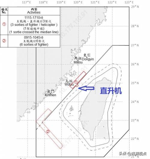 当天在台海的中部有3架战机,但其中一架是直升机,并且突破了所谓“海峡中线”。(1处)