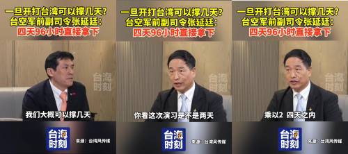 同年5月28日台军退役中将、前“空军司令”张延廷在节目中透露:“如果两岸开打,台军最多撑四天”,也就是96小时。