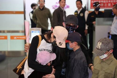 刘振亚(左)离开台湾前在登机口与家人拥抱道别
