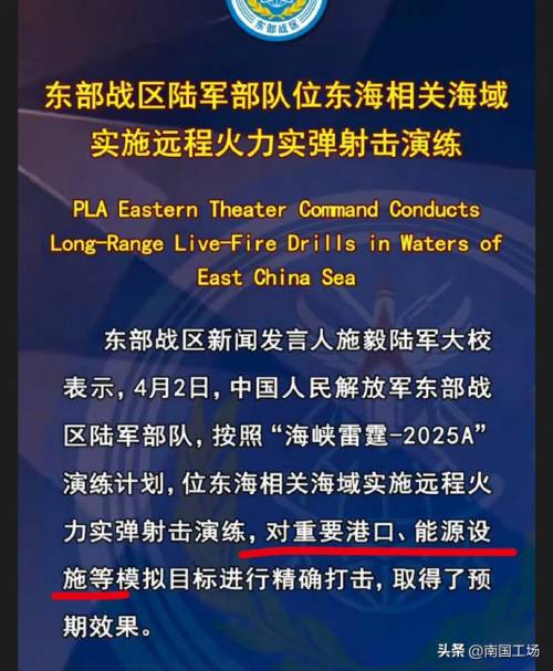 2025年4月2日,在解放军东部战区组织的“海峡雷霆2025a演练”中,解放军展示了超级远程火箭炮演练隔海打击岛上目标。而目标标靶,这个白色的,怎么那么像台湾省岛上,装石油天然气的那种大油桶,大油库,或者天然气储备地呢?看通告,未来统一的时候,解放军第一轮打击将是包括水电气在内的一切台湾省岛内基础设施。