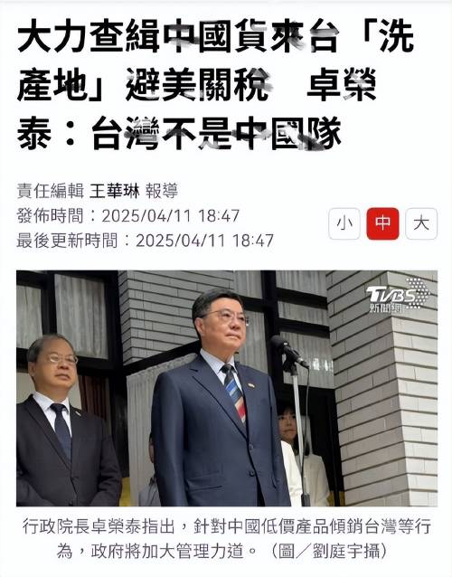 据台湾无线(TVBS)报道,民进党分裂政权高官卓荣泰表示,针对中国低价产品倾销台湾等行为,伪政府将大力查缉中国货来台“洗产地”避税。卓荣泰还表示,台湾不是中国队。