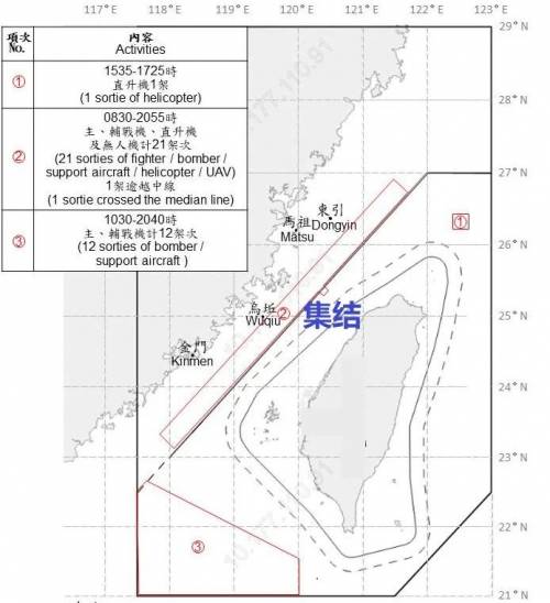 当时大部分的战机正在台海中线附近进行“队形编组”、“集结”演练。