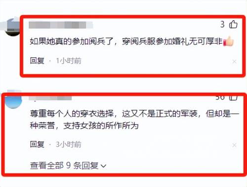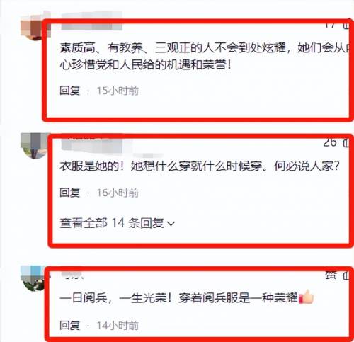 还有一种声音则用“炫耀”“砸场子”“不尊重军装”来批评指责这位女兵。