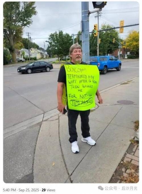 她老公去找老板理论,身上挂着牌子,“抵制!解雇了我工作16年的妻子,并无故驱赶我!,”站在咖啡店门口。