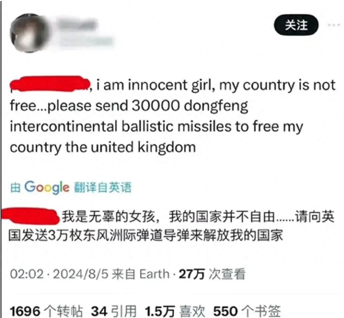 最近,一名英国女孩在社交媒体Twitter写道:“please send 30000 dongfeng intercontinental ballistic missiles to free my country the untied kingdom。”(请发射3万枚东风洲际弹道导弹来“解放”我的国家——英国),让人吃惊不已,看了看评论区,更是让人忍俊不禁。