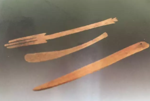 以下为1995年于中国青海同德县出土的骨质餐叉,勺、刀。在经过碳14测定之后,这批被誉为“人类餐具之祖”的餐具,诞生于距今5000年前。