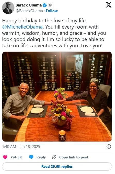 17号是米歇尔生日,奥巴马在多个平台发了夫妇合照,祝愿妻子生日快乐。