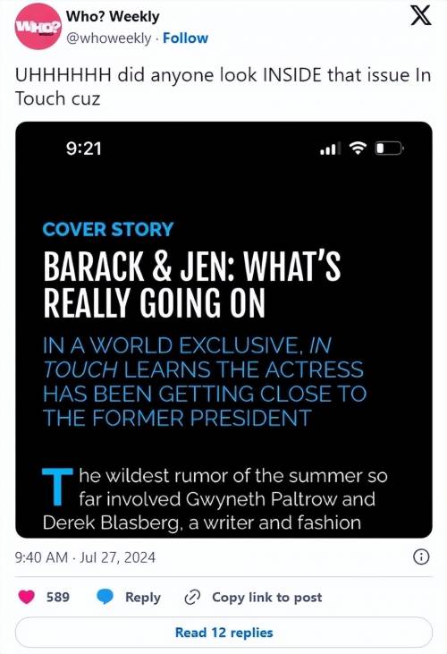 “他和Jennifer Aniston在一起了。我以前的经理认识她内层圈子里的人。在一次聚会上,有人偶然提起了奥巴马的传闻,Jennifer本人承认了。在她最亲密的朋友圈里,这已经不算什么秘密。”