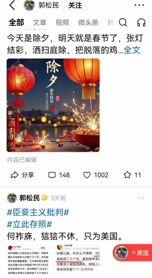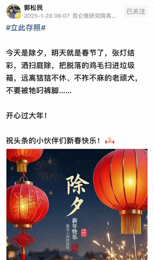 在中国大年除夕夜,郭松民发这篇小作文是不合适的,既破坏了节日氛围,又违背了公众人物应有的行为规范和社会责任。希望今后多探讨老百姓关注的民生问题,少谈“主义”之争!