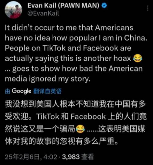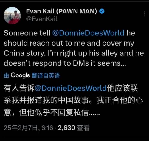 这不在7号的时候,他在自己的外网账号上发了条动态,表示有网友建议他联系名叫“Donnie Does World”的一家外国媒体来报道他在中国的故事,对此埃文也倍感高兴,但是埃文表示自己私信了这家外媒,但迟迟没有得到回复。