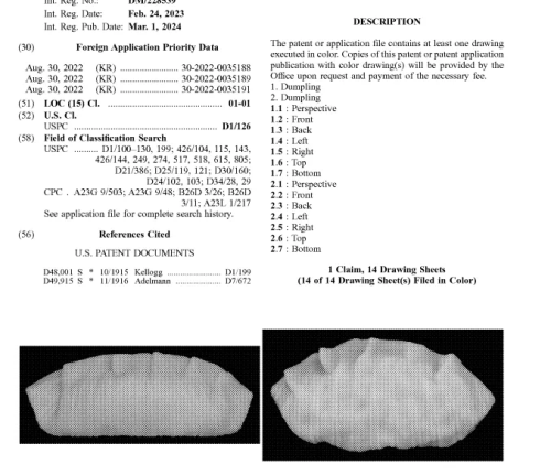 韩国速冻饺子品牌必品阁对外宣布,他们向美国专利局申请的饺子外形专利已经获得批准。这项专利描述专利饺子的形状是,“底部平坦、顶部隆起的半圆形面皮,褶皱数量在14-16道之间,呈现顺时针螺旋状收口”。