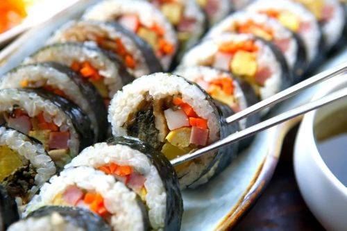 再比如源自日本寿司的紫菜包饭,韩国人舍弃了依靠寿司醋或寿司饭发酵获取酸味、再蘸食芥末和酱油的吃法;只选取整张紫菜包裹的单一外形,并在制作过程中,就把调味用的盐、芝麻油和芝麻包进饭团里;此外,或许是物产不如日本丰富,又或许受汉明文化的影响比较深,骨子里看不起日本人的嗜食生肉,韩式紫菜包饭里没有生鲜肉类、鱼生、鱼籽,而是加入了蛋皮、胡萝卜、黄瓜、肉松、蟹柳、火腿等熟食。