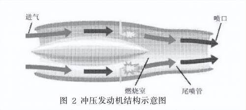 其工作原理是首先通过进气道将高速气流减速增压,在燃烧室内空气与燃料发生化学反应,通过燃烧将化学能转变为气体的内能最终气体经过喷管膨胀加速,排入大气中,此时喷管出口的气体速度要高于进气道入口 的速度,因此就产生了向前的推力。