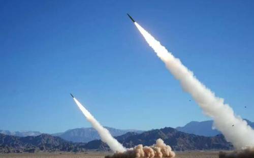 ▲解放军陆军pCL-191型某型火箭炮齐射BRE-10弹道导弹的瞬间