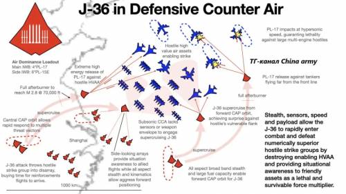 也就是说,歼-36利用超远程空空导弹与忠诚僚机重点打击F-47和F/A-XX身后的轰炸机(如B-2、B-21和B-52)和辅助机群(如E-3、E-8、RC-135U和KC-46等),