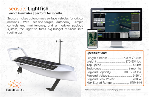 而L3哈里斯公司所利用的无人艇载具,就是这个Seasats公司研制的Lightfish无人艇。该型无人艇上加装了所谓的紧凑型电子战载荷,用于收集射频信号,上传至云端,后台进行分析,生成对抗策略,对抗过程中,无人艇始终都是重要载体。