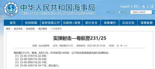 第一则公告由广东汕头海事局发布,明确了解放军将在汕头外海进行一次实弹射击,且禁航区的位置恰好处于南澳岛西南海域。