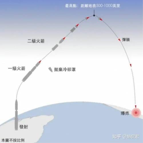 洲际导弹飞行过程中段(亚轨道飞行阶段)——本阶段约25分钟,期间洲际弹道导弹主要在大气层外沿着椭圆轨道作亚轨道飞行,轨道的远地点距地面约1200公里,椭圆轨道的半长轴长度为0.5倍~1倍地球半径,飞行轨道在地球表面的投影接近大圆线(之所以是“接近”而非“重合”是由于飞行期间地球本身自转造成的偏移),在本阶段携带多弹头重返大气层载具或者是分导式多弹头的洲际弹道导弹会释放出携带的子弹头,以及金属气球、铝箔干扰丝和全尺寸诱饵弹头等各种电子对抗装置,以欺骗敌方雷达。再入大气层段——从距地面100公里开始计算,飞行时间约2分钟,撞击地面时的速度可高达7公里/秒(早期的洲际弹道导弹小于1公里/秒)。