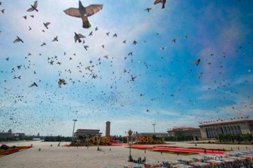 这8万多只和平鸽据说是北京信鸽协会借来的,它们来自于北京各个区,凭借自身象征的“和平”意义很荣幸的参与了祖国的纪念的活动。