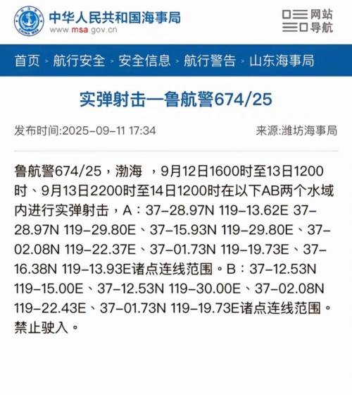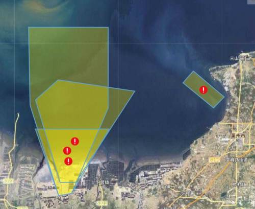 去翻中华人民共和国海事局的航行警告,果然就翻到了一个鲁航警674/25的航行警告,如下就是那些坐标,连起来大概就是下图这些区域:
