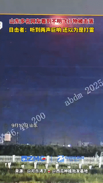 2025年9月12日晚间,山东潍坊、日照、济南等多地居民目击夜空出现了高速飞行的不明飞行物,据目击者以及拍摄的视频显示,一个高速下坠的火球被另一个反方向同样高速移动的火球拦截,空中迸发出一个高亮的火球!据目击者称,天空中随后传来一声巨响,部分居民称门窗都随之震动!