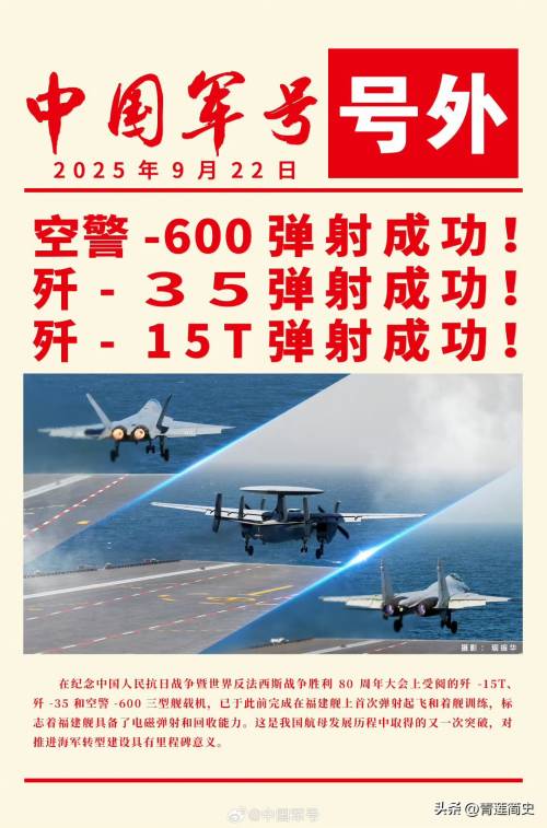 9月22日,中国海军高调公开了福建舰歼-35战机的消息,中国成为了全世界首个成功弹射并部署第五代隐身舰载战斗机的国家。福建舰当天还弹射了空警-600预警机和歼-15T舰载机,三款战机同时从福建舰上弹射成功,标志着中国海军的战力得到了实质性的提升。