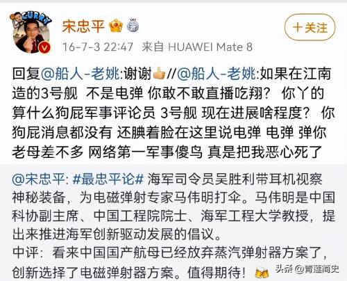 宋忠平的这一番言论发表后,却引来了微博大V“船人老姚”的疯狂声讨,这个自称“船人老姚”的博主对宋忠平的预测深感不满,对宋忠平进行了多次的口诛笔伐,甚至上升到了爆粗口骂人地步。“船人老姚”自称有船舶工作经历,比宋忠平更懂舰船和航母,宋忠平的预测显示了他的水平是很差。