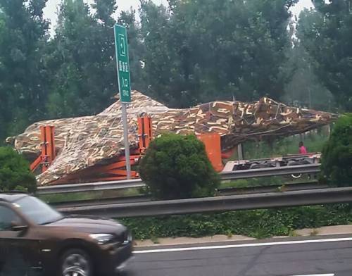 照片显示,一架覆盖着迷彩篷布的战斗机(静力试验机),被一台大卡车拉着在高速公路上一路前行,同时还有警卫部门的车辆随行。拍摄者爆料称,照片是在从沈阳到山西的高速公路上拍到的。