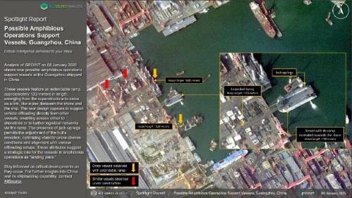根据卫星照片和外媒的相关报道,中国正在广船国际龙穴造船厂建造至少5艘新型特种驳船,这些驳船在设计上有着显著的创新。与传统的登陆平台不同,这些驳船不仅具备巨大的载重空间,还配备了可以伸展超过120米的坚硬桥梁,能够绕过传统登陆所需的滩头栈桥,直接将桥梁搭接到公路或其他硬质地面。简而言之,这种新型驳船能够帮助解放军在任何海岸进行快速、高效的重型装备登陆。