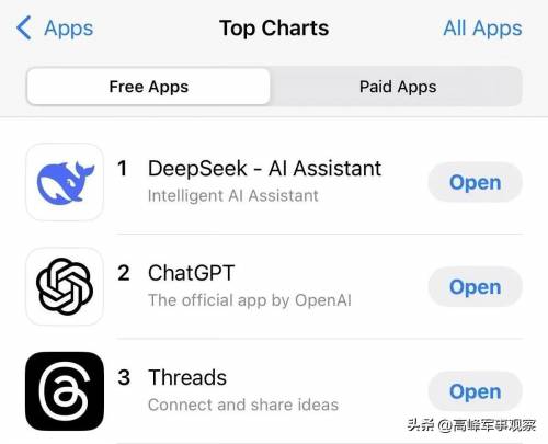 但无论是歼-36,还是小红书,对美国媒体的刺激都不如Deepseek的大!与歼-36首飞消息出来后美国媒体集体“装死”相比,这次Deepseek超过GhatGpT 冲上美国手机应用商店AI App下载榜第一位置(DeepSeek目前已在全球十三国App Store登顶),把美国媒体和美国鹰派政客都震撼到了。美国主流媒体不惜周末加班报道“Deepseek带来的技术奇迹”。有美媒体人表示,相比歼-36,Deepseek才是美国需要客观面对的“斯普尼克时刻”。