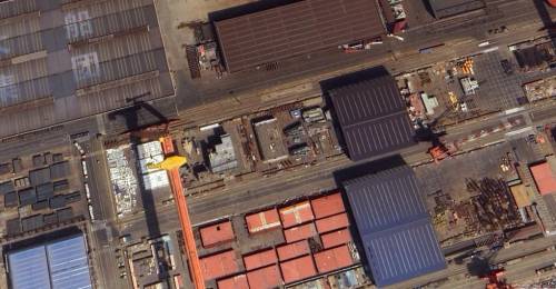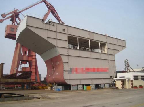 根据美媒报道,大连造船厂出现了一个用于大型水面舰艇的“模块”,上面还有“线条”,美媒推测这应该是航母甲板斜角分段,上面的“线条”是器轨道沟槽。