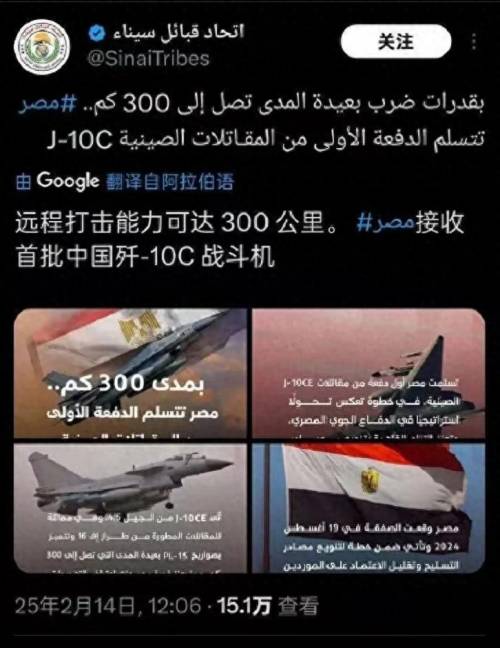 根据资料,埃及于2024年8月与中国签订40架歼-10C的采购合同。2025年2月16日,埃及空军正式接收第一批歼-10C战机,并且配备了霹雳-15E 远程空空导弹。