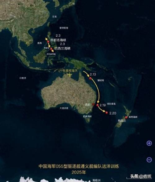 在2月19号到2月20号这段时间,解放军055大型导弹驱逐舰遵义舰率领的水面打击群,从澳大利亚东海岸约150海里的位置向东南一侧航行到澳大利亚和新西兰之间的塔斯曼海域,并且在该海域进行实弹射击训练。