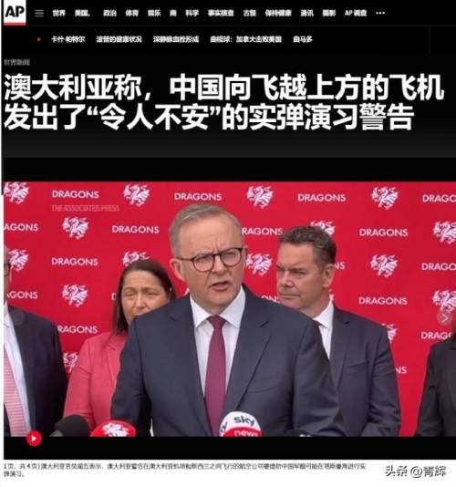 美联社在对外发布的消息的时候,指出,澳大利亚方面认为中国向飞越上方的飞机发出了令人不安的实弹演习警告。
