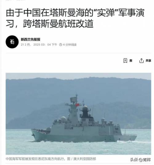 而新西兰的先驱报21号发布的消息也是突出提到了解放军的战舰编队在塔斯曼海进行实弹军事演习,以及相应的民航改道的相关内容。