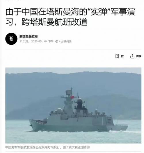 最近几年,澳大利亚频繁出动舰艇和飞机闯入我国南海,甚至有时候还会侵闯我国南海领空,比如在今年2月份一架澳大利亚p-8A反潜巡逻机就试图侵闯中国南海西沙群岛领空,被解放军歼-16战斗机拦截驱离。另一个“五眼联盟”国家新西兰也是如此,2024年新西兰海军出动舰艇与美国、日本、菲律宾等国家在南海大搞军事演练。澳大利亚和新西兰的这些举动,不仅对南海的安全和主权构成了挑战,同时也是一种典型的插手干涉南海问题的行为。所以说,中国海军此次在塔斯曼海域实弹演练,澳大利亚和新西兰需要反思一下,为何中国海军把演练的地点选在了这里!