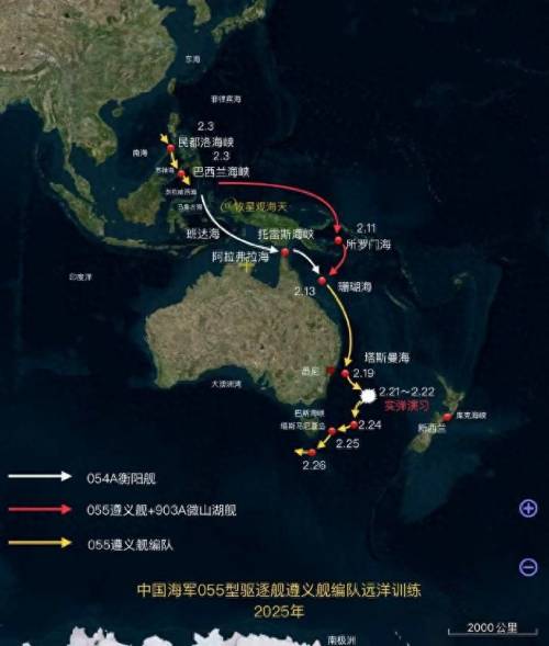 新西兰国防部2月26日在其国防部网站发布消息证实,当地时间2月26日上午,由包括055型导弹驱逐舰遵义舰在内的三艘舰艇组成的中国海军编队位于塔斯马尼亚岛南部,进入澳大利亚专属经济区,并向西移动。这是中国海军作战舰艇编队首次进入澳大利亚南部的塔斯马尼亚岛以南海域。