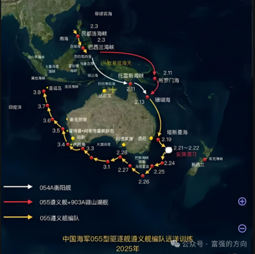 整理这支编队的海上航行轨迹,堪称“绝妙轨迹”。具体来讲,就是对菲律宾进行了切割,然后又对澳大利亚进行了一圈”环岛游“。