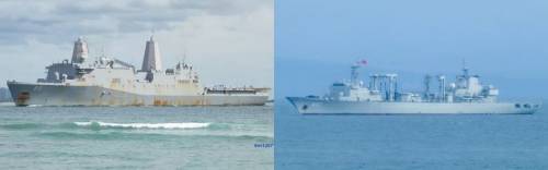 “西边的太阳快要落山了,微山湖上静悄悄。”(西半球的美军圣安东尼奥级两栖船坞运输舰,与东半球的综合补给舰“微山湖舰”。)