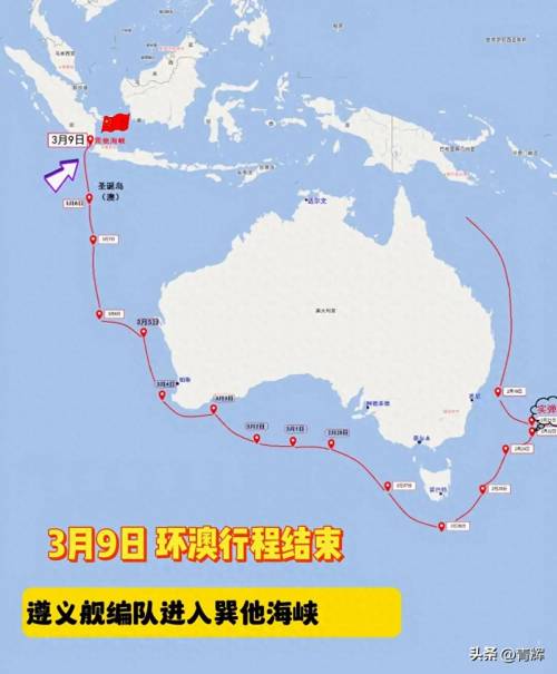 而之所以出现这种情况,于近期刚刚完成对澳大利亚进行半环绕航行的055导弹驱逐舰遵义舰出现了直接北上的相关动作。关于我们的这支远洋编队的行动路线,我们可以从下面的简略示意图中看出一个大概。